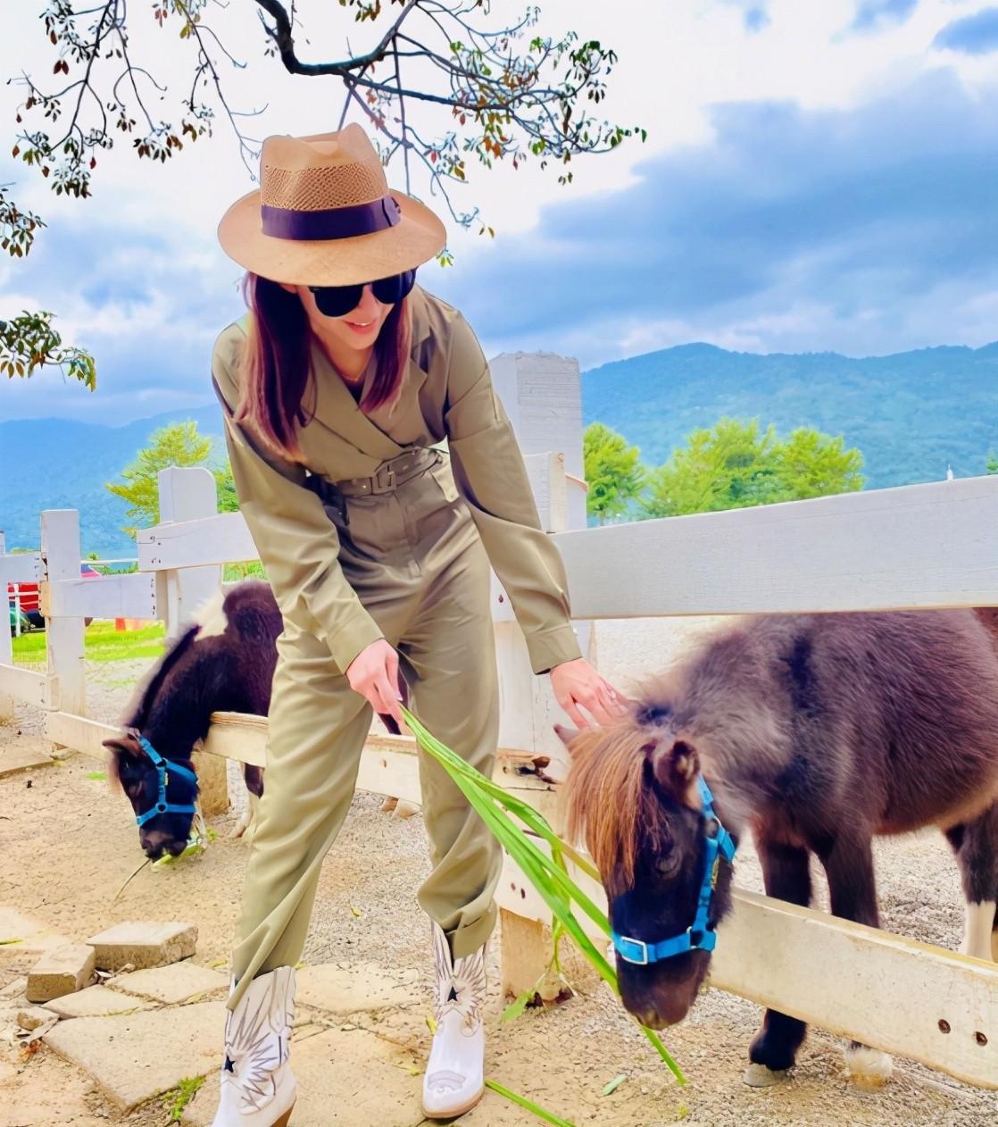 身材凹凸有致,年轻紧致,面容小巧精致,配上甜甜笑容,真是让人羡慕又嫉妒,一点看不出是两个孩子母亲,时髦靓丽。
