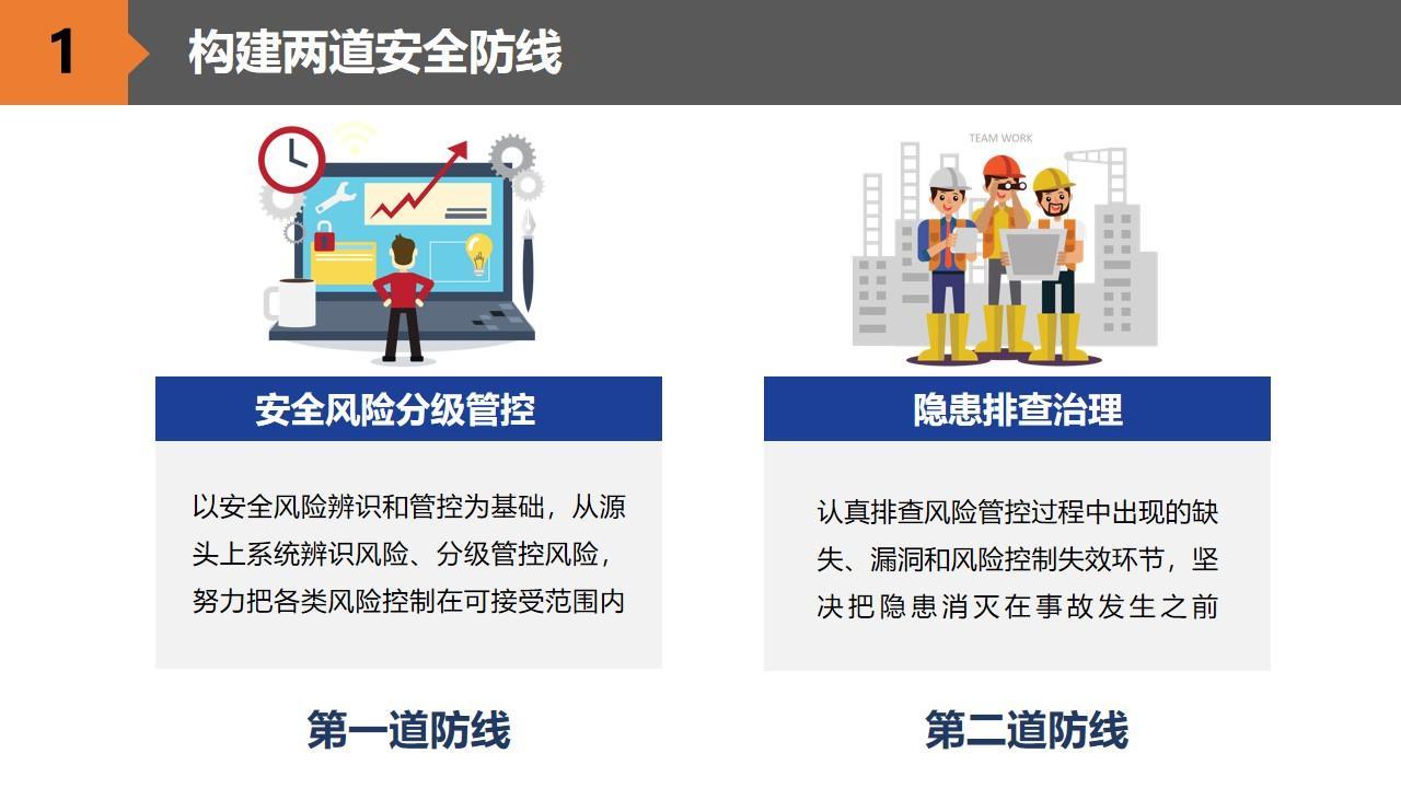 这段话可能大家听过看到过很多遍,还是没有办法很好的理解,还是搞不明白。实际是就是构建了两道安全防线,第一道是安全风险分级管控,以安全风险辨识和管控为基础,从源头上系统辨识风险、分级管控风险,努力把各类风险控制在可接受范围内。第二道是隐患排查治理,认真排查风险管控过程中出现的缺失、漏洞和风险控制失效环节,坚决把隐患消灭在事故发生之前。