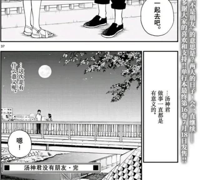 故事到了最后,汤神依然义正言辞的说着自己没有朋友,汤神与千寻也顺利地进入了不同的大学,然而漫画最后一格的场景作者的意思不言而喻,我们也有理由去相信,即便漫画已经画下了句号,但这两个人的故事还没有结束,他们会一直这样下去,自然而然地走到一起。