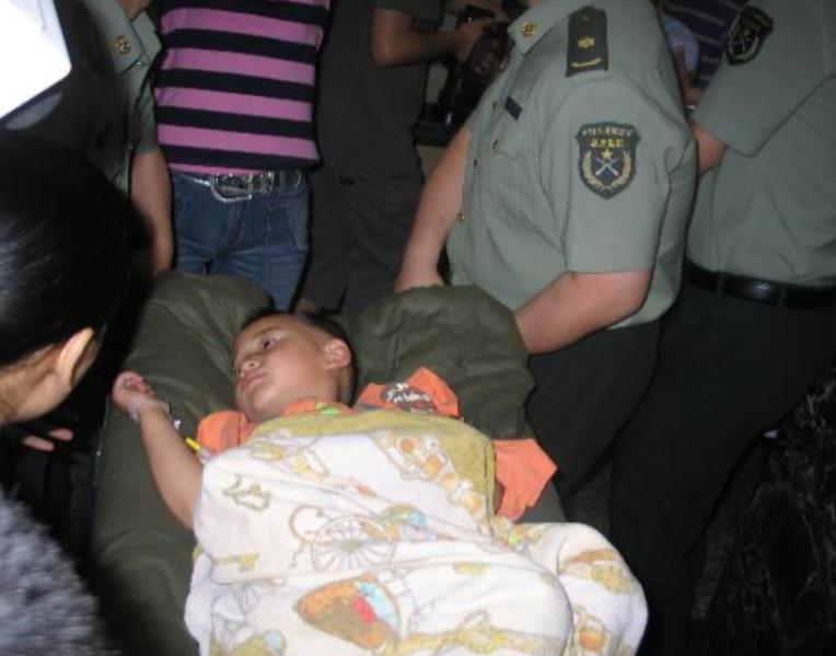 军人战士将郎铮从废墟堆里抬出来,孩子的身上到处都是血迹,左臂也明显肿胀,郎铮在被救出来后就乖乖的不哭,他躺在木板上,配合着杨卫华给他喝水。