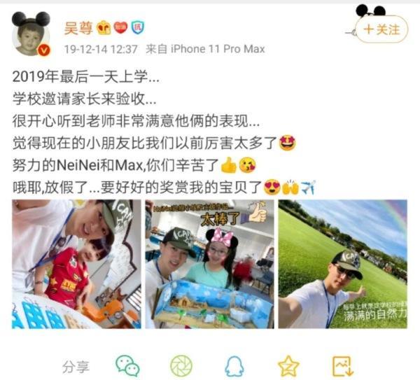 自从吴尊公开了家庭以后,他的微博里常常会晒出和家人相处的日常。
