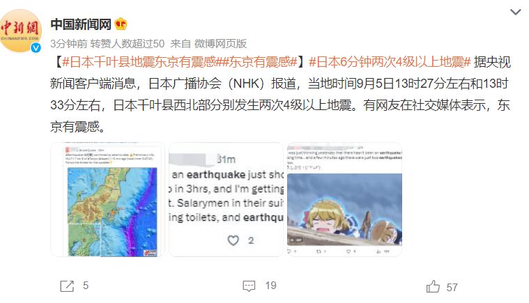 日本6分钟两次4级以上地震!这地震的频率的确是有点高,发生的区域都是在日本千叶县西北部。