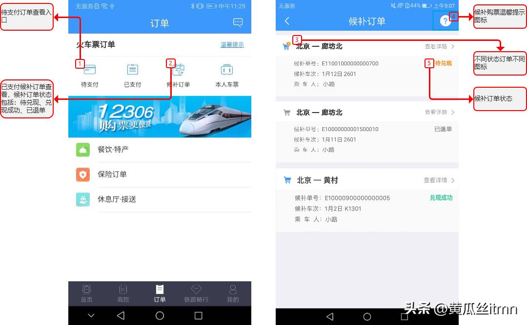 App上点击导航项“订单”中的“候补订单”可查看所有已支付候补订单,未支付订单可以在“订单”项的“待支付”中查看。
