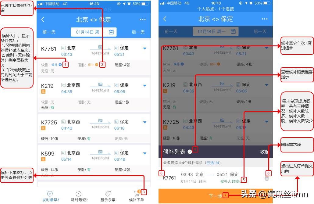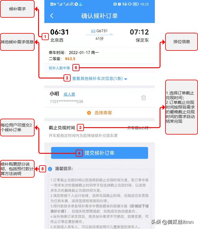 每位用户可提交2个候补订单,每个订单中可添加发到站相同(可以是同城的不同车站)的2个相邻的乘车日期,每个乘车日期可添加5个不同“车次+席别”的组合需求。