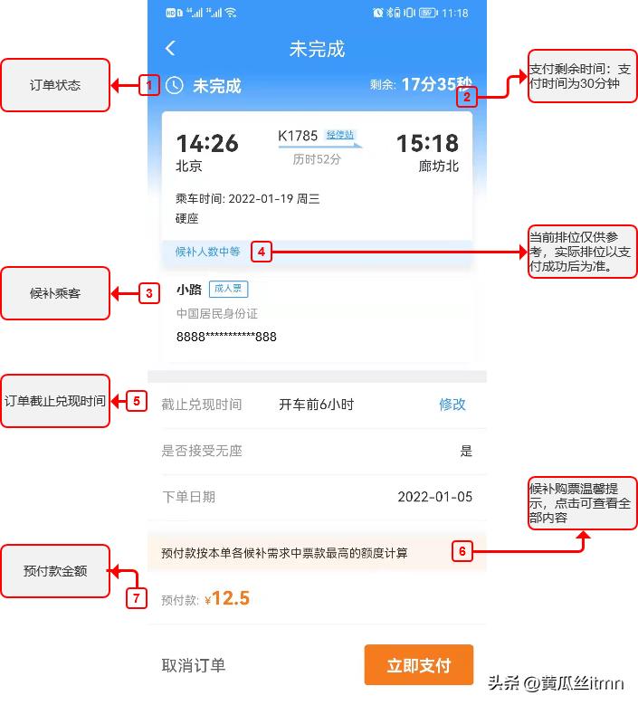 候补订单提交成功后请在网站提示的时间内完成在线支付,完成候补预付款支付后,候补购票订单立即生效。候补购票订单生效后,相关候补需求不可修改,如需变更,可终止订单后重新操作。兑现时,按照候补订单生效的时间顺序,优先兑现符合条件的候补需求。预付款按该单不同组合需求中票款的最高额度计算(卧铺按下铺票价计算)。