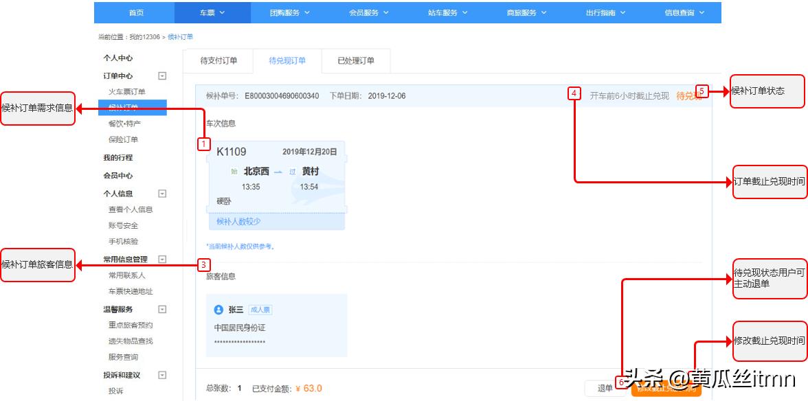 网站上在个人中心导航栏上点击“候补订单”可进入订单查看页,候补订单分为“待支付订单”、“待兑现订单”和“已处理订单”三个选项,其中“已处理订单”包含已兑现、已退单和兑现失败三种状态订单,已兑现表示候补需求兑现成功;已退单表示用户主动退单;兑现失败表示候补需求兑现失败,可能为车票数量不足、旅客行程冲突等原因。