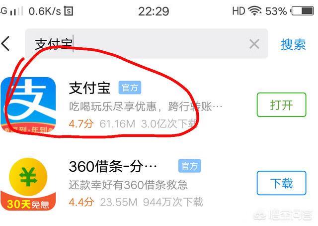 一般现在手机用支付宝的比较多,手机上先在应用市场下载支付宝app,如图