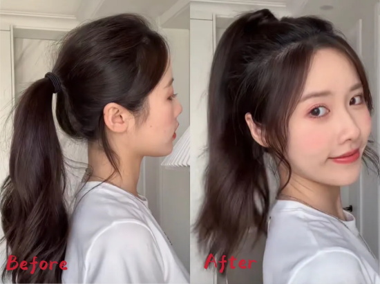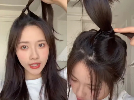 另外需注意的是,马尾要扎的高才会有元气满满的少女感,否则就是毫无精气神的邋遢小妹了。像这样在头顶先扎一个掏了洞的小辫子,然后再把扎好的马尾从洞里钻进去,小辫子就能起到固定位置的作用了,不用担心马尾会塌下来。