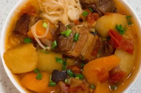 将牛腩洗净后焯水片刻,再倒入已经炒化冰糖的锅内翻炒至牛腩上色,加入葱、姜、蒜、八角、桂皮炒香,之后倒入牛腩焯水的汤和少量盐煮开。倒入高压锅内压45分钟后,将炒好的西红柿、胡萝卜、番茄等食材倒入高压锅内,出锅前撒上葱花即可。