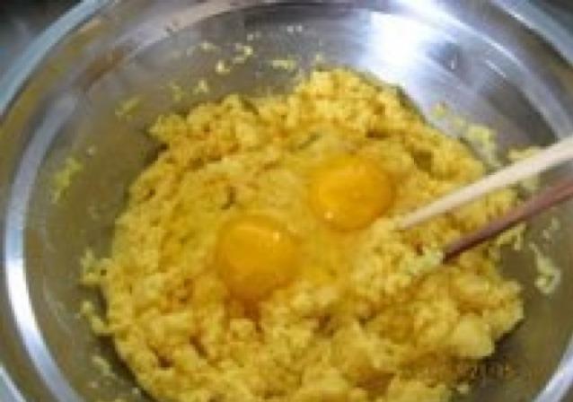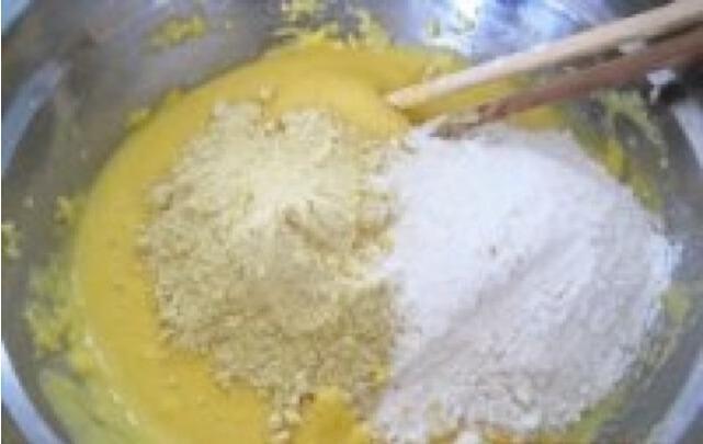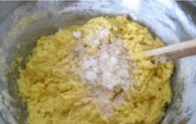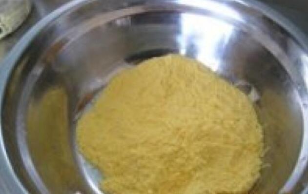 5、在玉米面里面加入酵母、豆粉、白面粉,要先放酵母,而且注意要在面是温的时候放,因为面太烫的话,会把酵母杀 死的,同样的话鸡蛋的话时候也要注意。