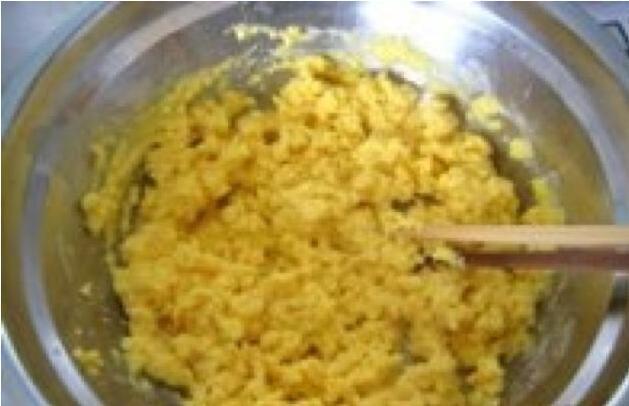 2、锅内烧开水,将开水一边倒到玉米面里一边进行搅拌,直到没有干面粉为止,湿点没关系。