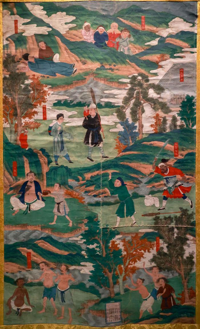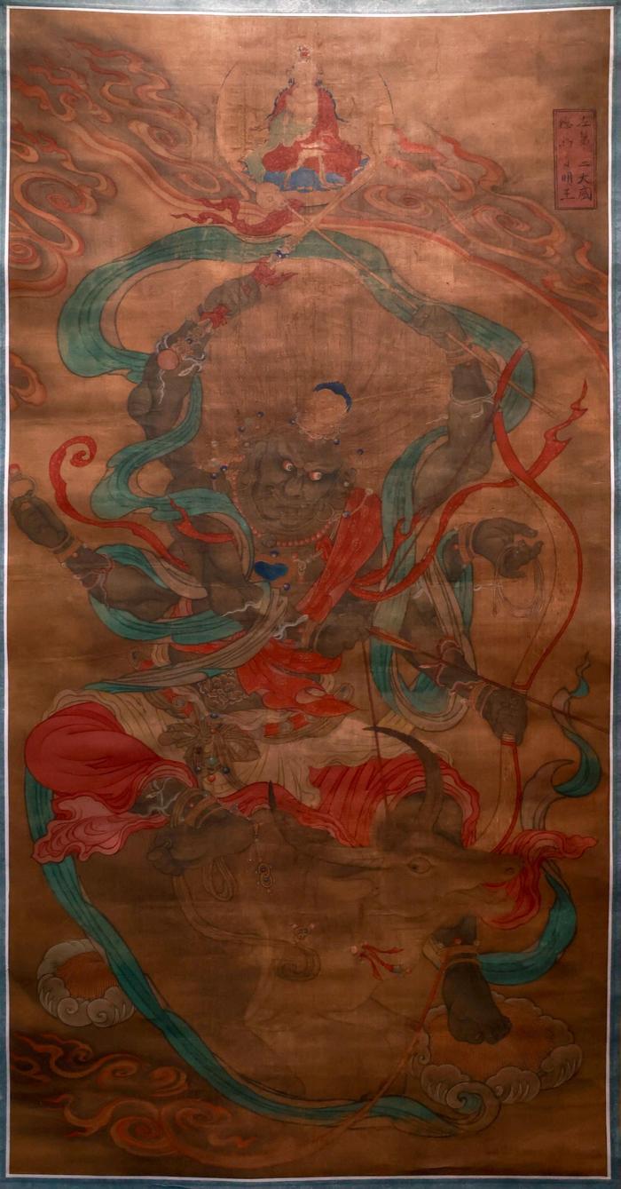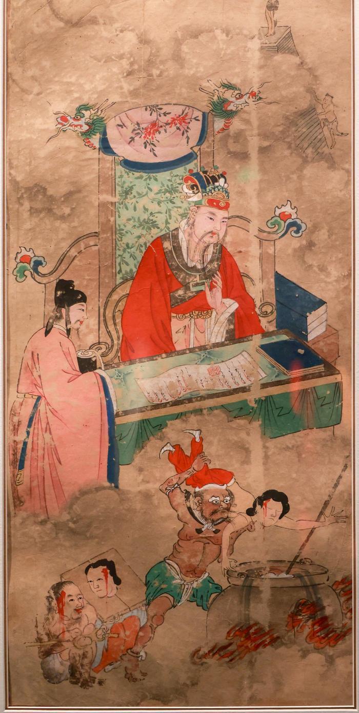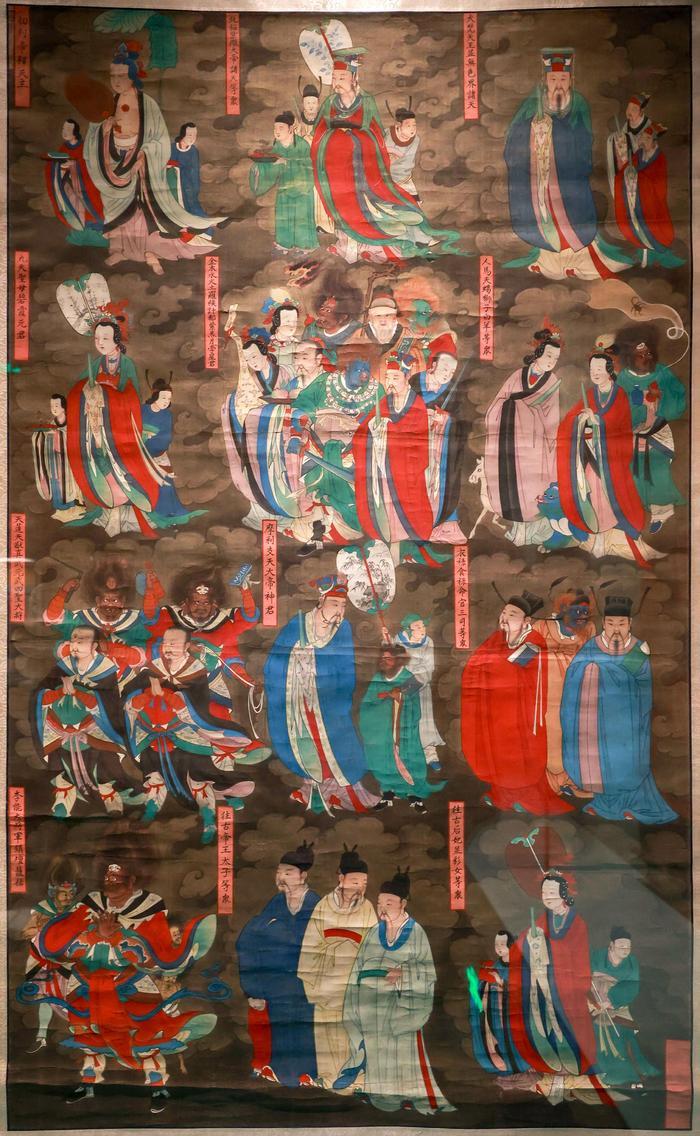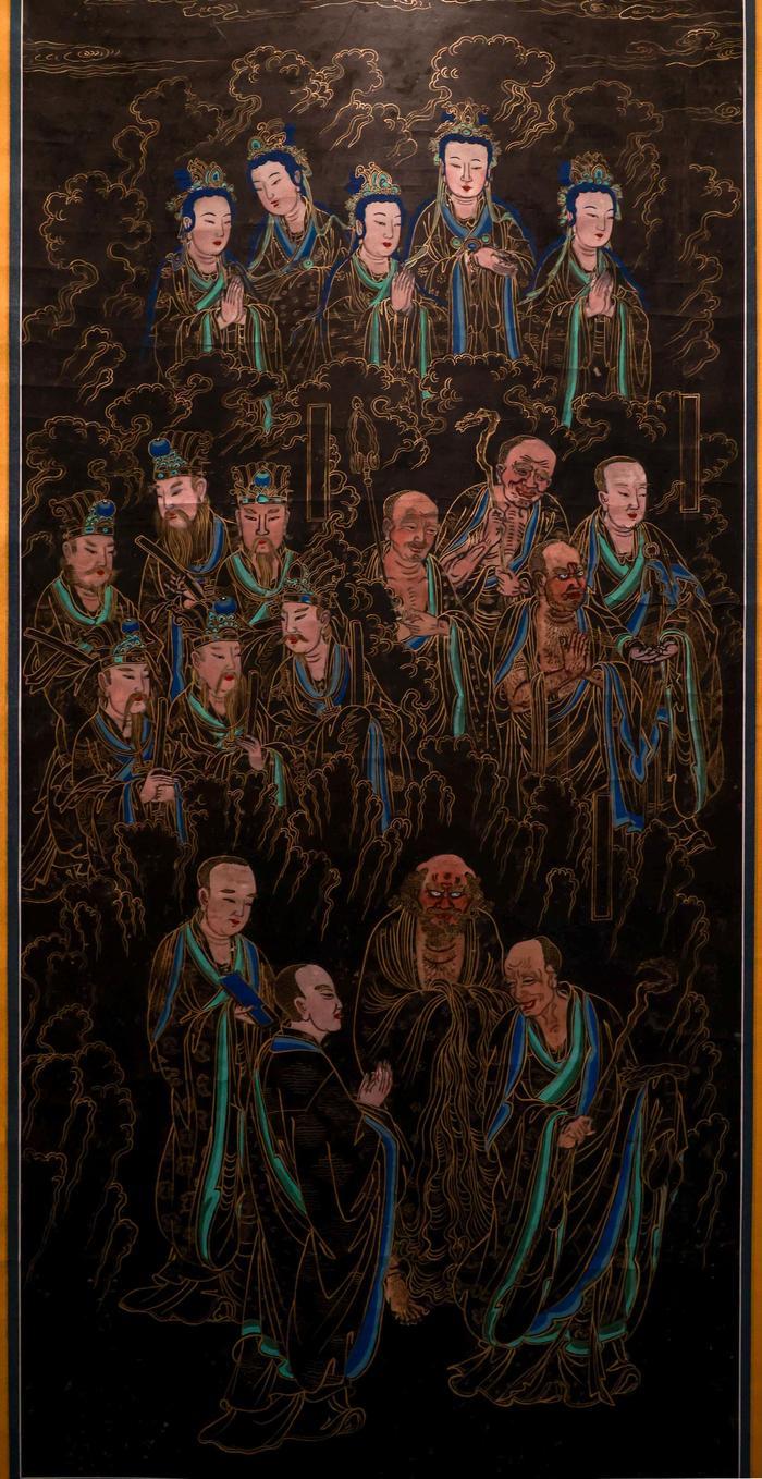 水陆画包括壁画、卷轴画、纸板画等形式,此次展览通过实物、图版等全面呈现水陆画艺术。由于年代久远,又经历过长期的烟熏火燎,水陆画大多已淹没不存,留存至今而又为人所知者并不多。又因其功能性强,仅供法会使用,所以就更鲜为人知。展览荟萃明天顺年间宝宁寺水陆画、明慈圣皇太后绘造水陆画等16幅宫廷水陆画以及山西、甘肃等地民间水陆画,珍贵文物占比近70%,其中一级文物11件,可谓重量级文物济济一堂,为我们比较研究、分类鉴赏以及全面认识我国水陆画艺术提供了可能。