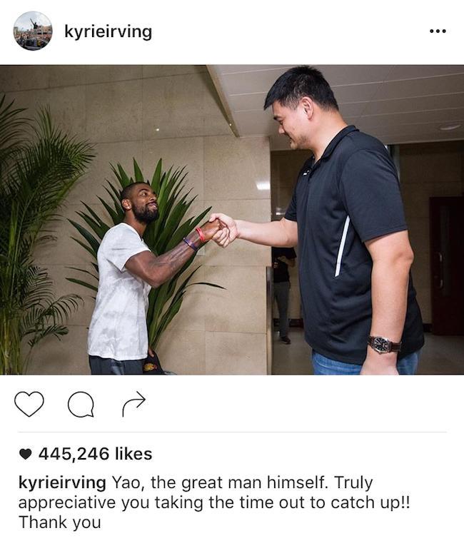 ▲7月24日,欧文见到了姚明,随后他在Instagram上发文表示感谢。
