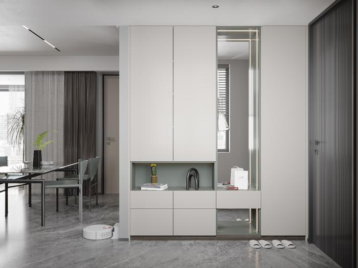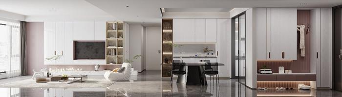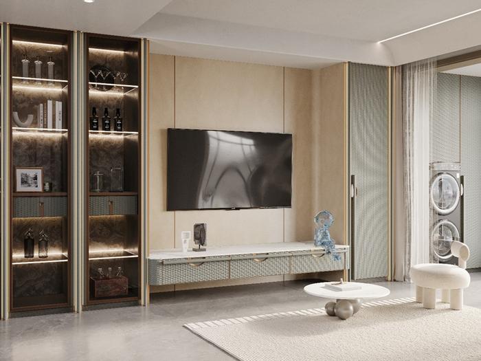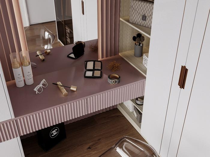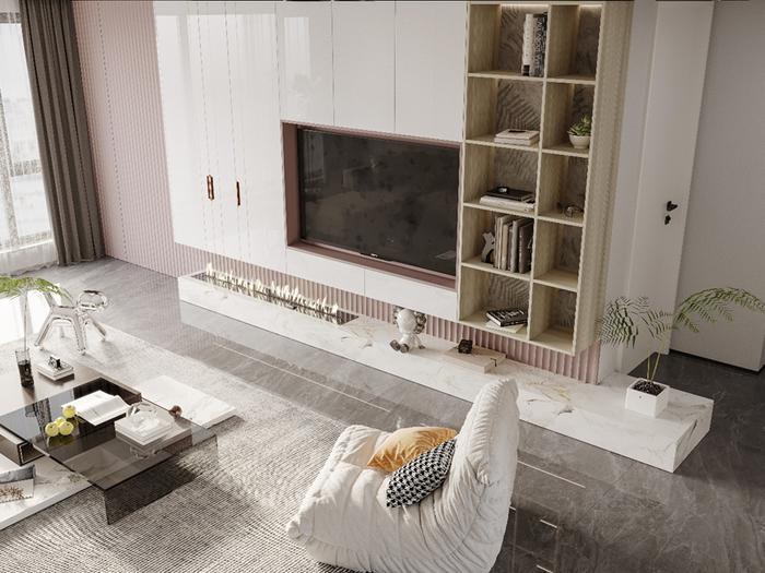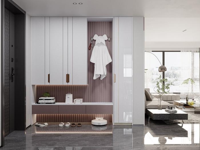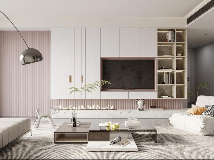 像玄关、电视柜、卧室周边都穿插上脏粉搭配,减少柜体的单一设计,颜值瞬间提高一百倍!