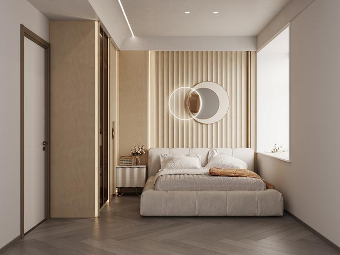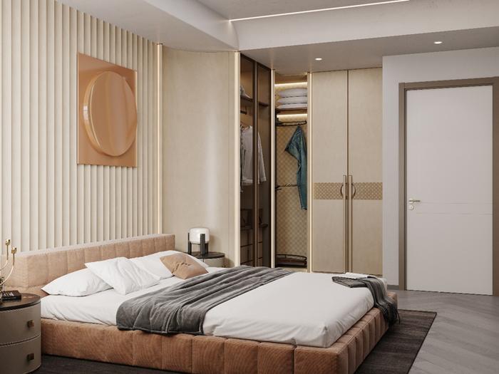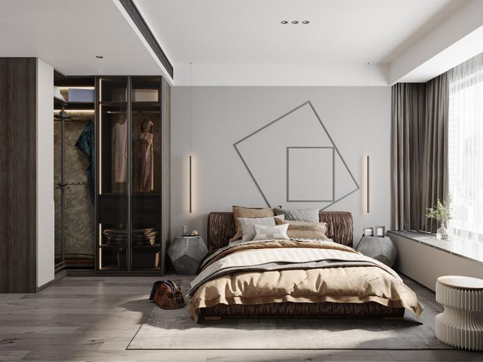 主卧、次卧使用奶茶色做主色,用一些暖咖色做点缀,搭配上浅灰菱格地板,满满的氛围感!!