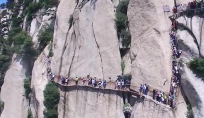 相信大家都知道华山“长空栈道”长空栈道位于悬崖绝壁之上,全由石钉塔上木柱而筑成,栈道的宽度也只有30厘米,游客来到这里只能贴壁而过,是全球最恐怖的悬崖栈道之一。