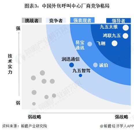 中国呼叫中心外包市场的竞争格局仍然比较分散。未来合并整合的趋势将会长期存在。中国呼叫中心主要建设方式分为自建和外包两种,传统电信、金融、民航、以及一些大型企业大都通过部署自建呼叫中心和外包呼叫中心来提供服务。而随着市场环境的变化,市场复杂性的增加,越来越多中小企业对呼叫中心需求不断增长,外包呼叫中心厂商竞争也愈发激烈,在中国市场,呼叫中心 BPO 行业领导者包括鸿联九五信息、北京九五太维、飞翱等 ; 表现较好的有易宝通讯、润迅通信等。