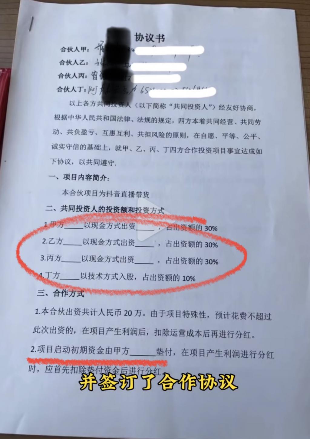 近日,蒋先生发视频回顾了他和刘先生的创业过往。2020 年蒋先生认识了刘先生,相识后一起去新疆库尔勒市创业,他带上了 75 万作为运作资金,经历了一次创业失败,2021 年 6 月再次创业,还是他出的钱,他们签订了合作协议,刘先生作为乙方占股 30%,刘先生的女朋友丙方占股 30%,出镜主播丁方占股 10%,而他自己 " 退让了很多 " 作为甲方占股 30%。