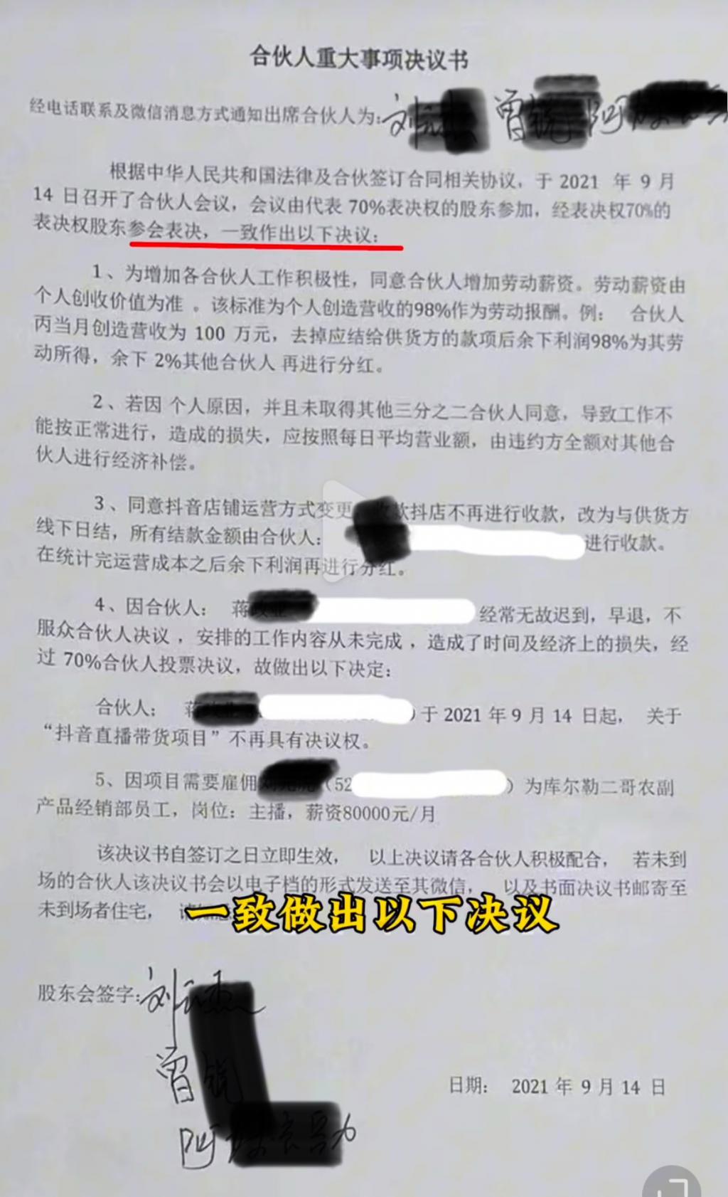 7 月蒋先生和刘先生做起了 " 疆域阿里木 " 这个账号,蒋先生将账号管理权交给了刘先生,过了一段时间后账号绑定手机号被刘先生替换成自己的了,刘先生还设置了权限,蒋先生看不到网店数据。视频中蒋先生说,噩梦开始于 9 月,7 日刘先生和另外两名股东联合签订了一个《合伙人重大事项决议书》,他在视频中也放出了决议书内容,里面写道蒋先生因为 " 经常无故迟到,早退,不服从合议人决议,安排工作内容从未完成,造成了时间和经济上的损失,经过 70% 合伙人投票决议,其不再具有决议权。"
