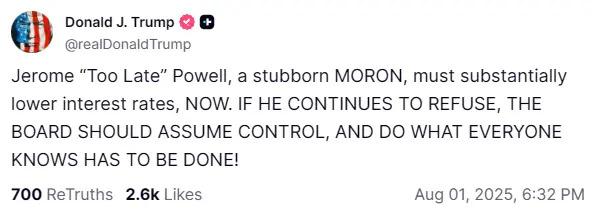 当地时间 8 月 1 日,美国总统特朗普在社交媒体上发文,再次就美联储迟迟不降息指责鲍威尔。特朗普写道,如果鲍威尔还不降息,美联储理事会应接管控制权。