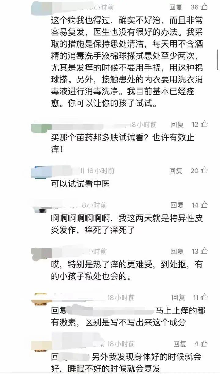 对特应性皮炎的这种痒,有广东的网友留言表示:我这两天就是特异性皮炎发作,痒死了痒死了。还有妈妈说," 儿子小时候幼儿园老师私下跟我说孩子摸私处,后来我和老师说了他有特应性皮炎,老师都看愣了。很多得这病的人都痒得难耐。没有感受过和了解过,真的不知道他们有多可怜。"" 特应性皮炎发作时真的很痛苦,我女儿从小到大受到不少歧视!"