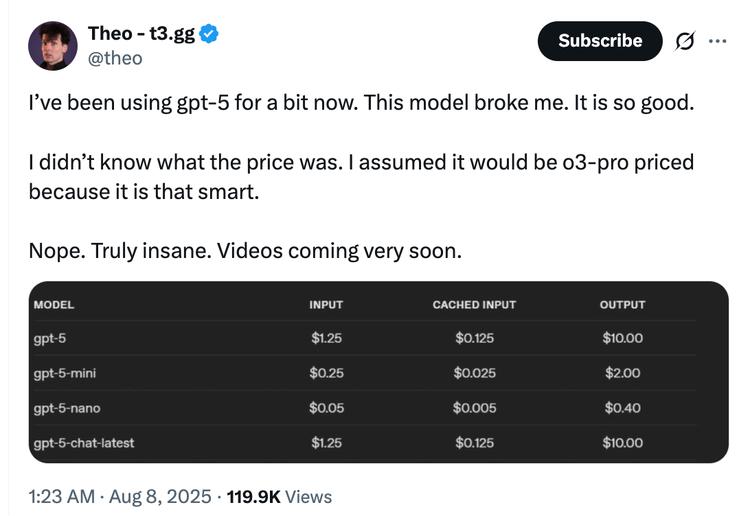 显然,新的价格让这些 " 苦 o3 久矣 " 的开发者们十分满意,当 GPT-5 标准版仅为 Claude 4 Opus 十二分之一价格时,那些靠 " 性价比 " 立足的平替厂商将面临生存危机。