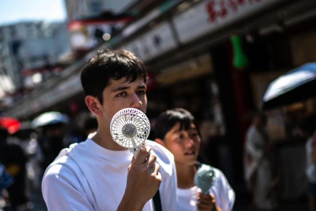 7 月 28 日,行人手持小电扇走在日本东京浅草街头 / 图源:新华社