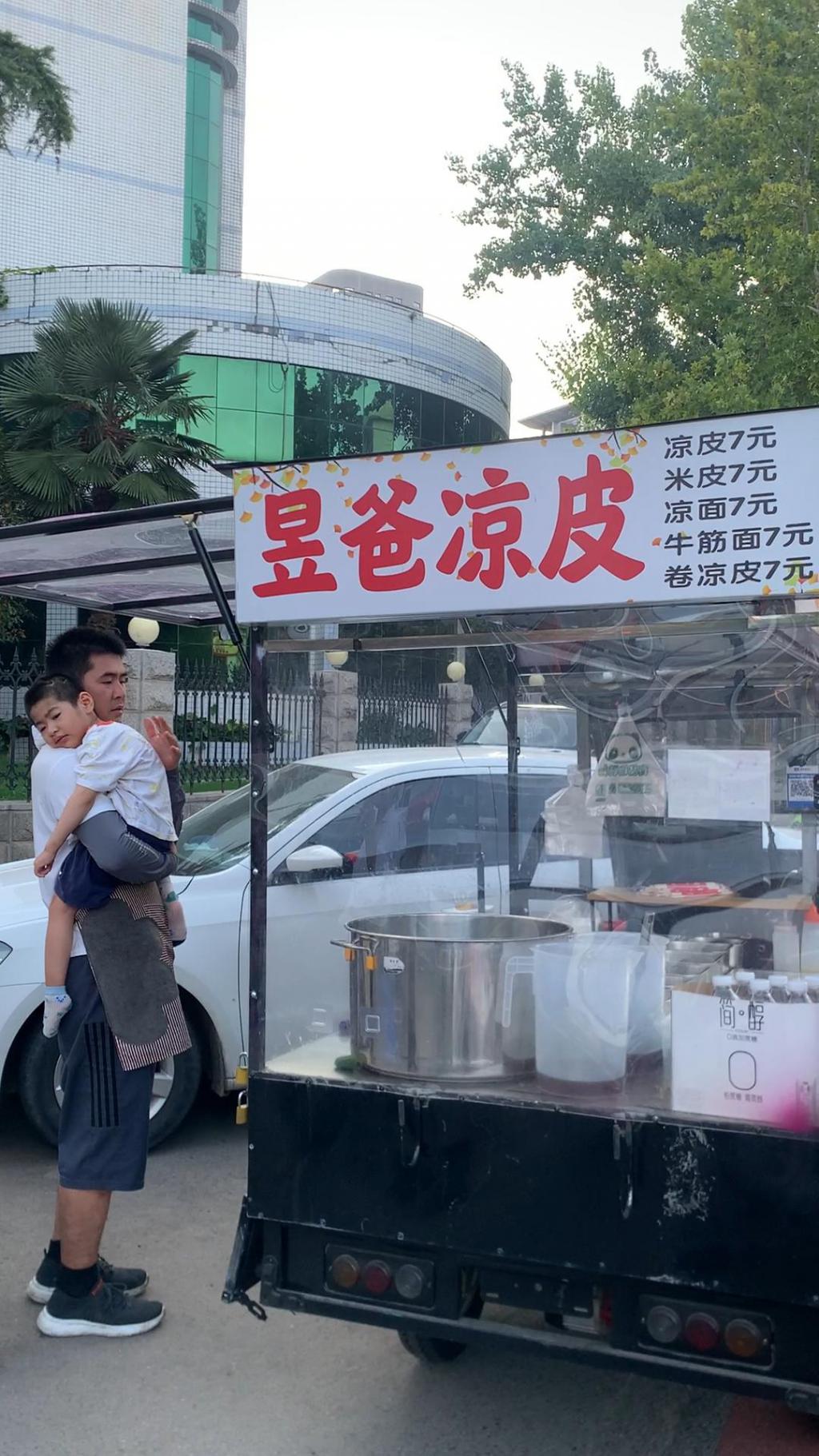 这辆命名为 " 昱爸凉皮 " 的摊子源于一次微光般的相遇。一位热心博主伸出援手,帮他一起支起了这辆承载生计与希望的小小凉皮车。" 我才慢慢一边带孩子一边摆摊。" 从此,傍晚五点至九点,是这对父子与城市的固定契约。因午间高温无法带孩子出门,家中又无人看护,他只能错过黄金时段,每天卖出 " 十几份,最多二十份 "。收入虽然不多,但他无比珍视这份能将孩子时刻置于视线之内的 " 移动港湾 "。