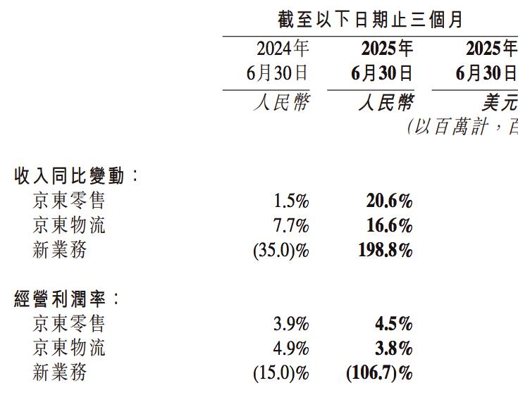 这也使得经营利润从去年同期的 105 亿元变成今年 Q2 的亏损 8.6 亿元,主要由外卖等新业务所致,主业经营利润率是有所提升的,并靠投资收益和营业外收入保住了整体净利润为正。分部看,京东零售的经营利润有 139.4 亿元,同比增 38%;京东物流的经营利润有 19.6 亿元,同比减少 10%;而新业务经营亏损 147.8 亿元,基本 " 抵消 " 了前两个业务的空间。