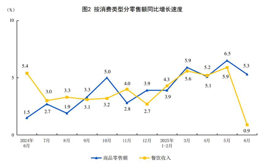 对比零售大盘,国家统计局给出的今年二季度批发和零售业收入同比增长 6%,住宿和餐饮业同比增幅 5.2%。如果单看 6 月份,社会消费品零售总额同比增长 4.8%,其中商品零售额增幅为 5.3%;而其中餐饮收入增幅从 5 月份的 5.9% 骤降至 6 月份的 0.9%。另据北京统计局,今年上半年北京住宿和餐饮营业收入同比下滑 3.7%,利润总额下降 67%。这样看,6 月份国补调整和新出台的餐饮新规的确减缓了刺激效果。