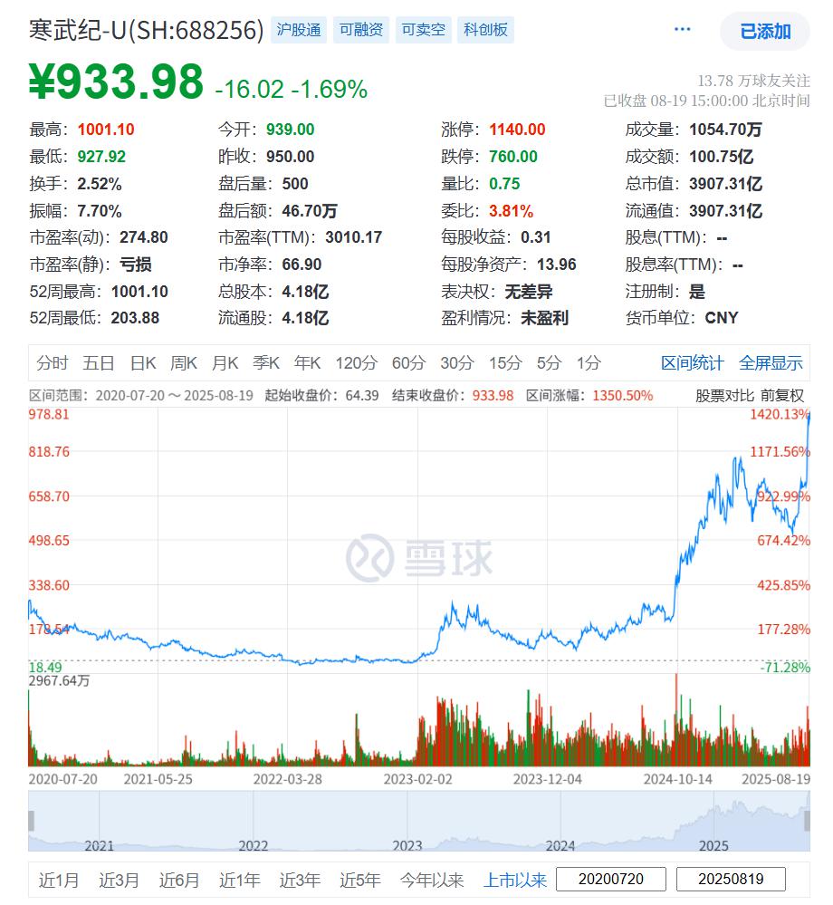 8 月 19 日,近期本就不太平的寒武纪开盘再度大涨,盘中股价达到 1001.1 元 / 股的里程碑,成为 A 股市场第二只千元股,盘中市值最高超过 4100 亿元。截至今日收盘,寒武纪股价报 933.98 元 / 股(仅次于贵州茅台),公司市值为 3907.31 亿元。