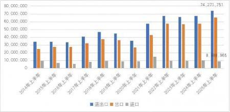 2014 年上半年至 2025 年上半年中国与印度双边贸易情况(单位:千美元)。