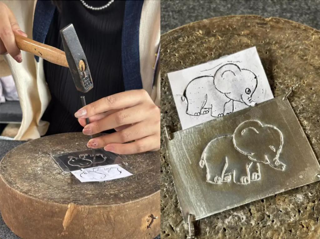根据模板敲出可爱的小象银饰。(图 / 受访者供图)