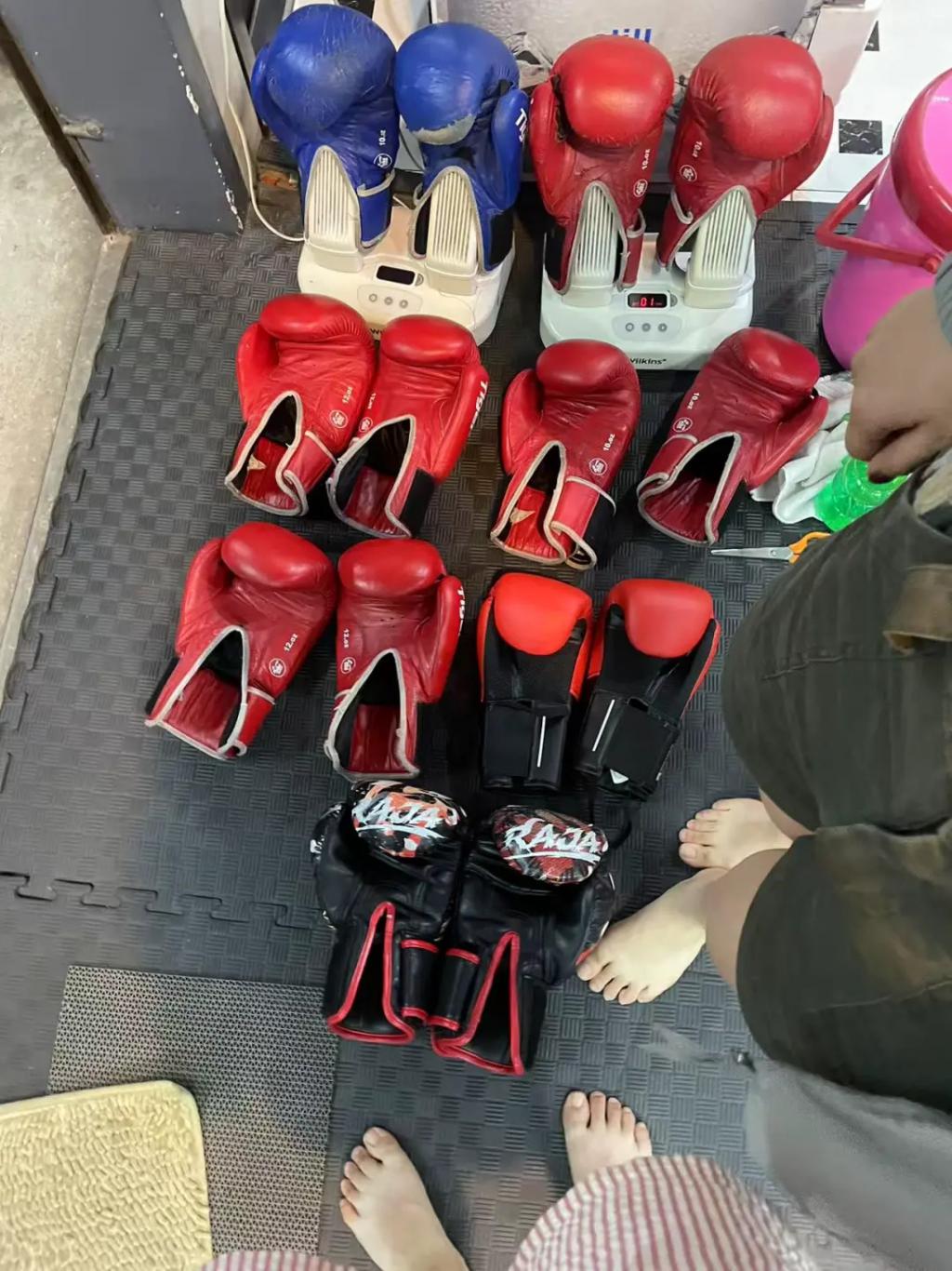 和十几个人一起上课的泰餐班不同,她的泰拳课只有 4 人上课,近乎一对一教学。教练用夹杂着零星中文的英文进行指导。课程从拉伸开始,迅速进入左勾拳、右勾拳、高踢腿的教学和对练环节。