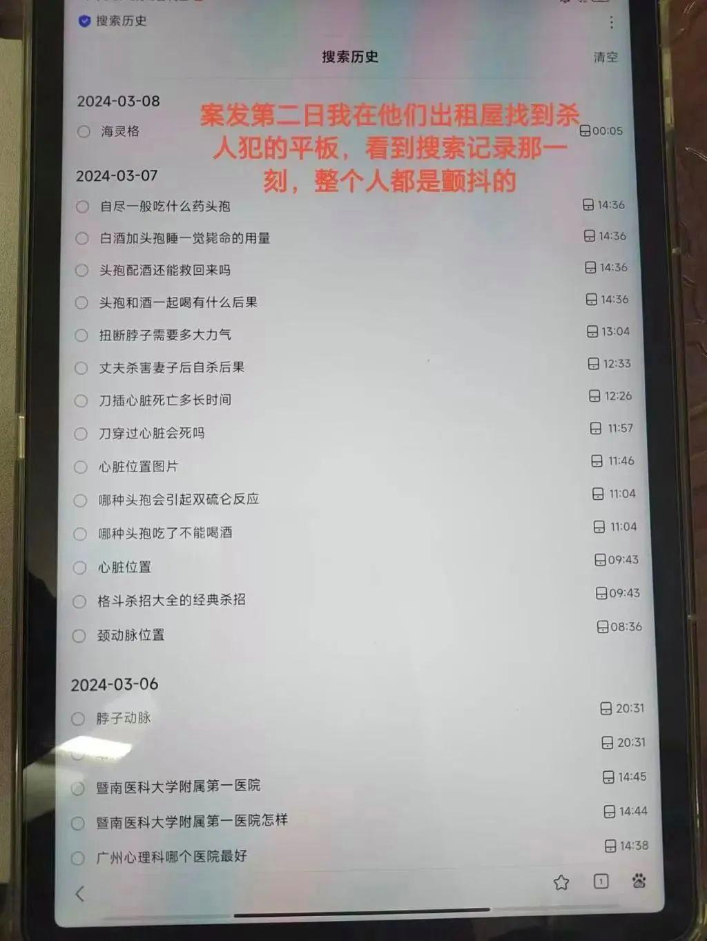 陈某某被杀害的第二天,其家人在杨某东的平板电脑上发现了令人不寒而栗的浏览记录。2024 年 3 月 7 日,也就是作案前一天,杨某东在网上检索了 " 如何杀人 "" 自杀 " 等相关信息。