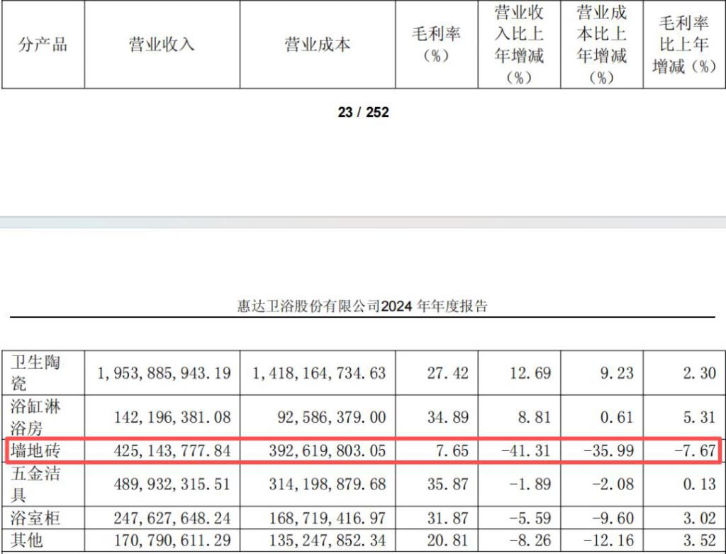 根据惠达 2024 年年报数据,公司陶瓷砖(墙地砖)业务营收约 4.25 亿元,同比下降 41.31%;毛利率大幅下降至 7.65%,是惠达主营业务中唯一一个毛利率低至个位数的业务。