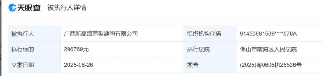 2025 年 8 月 26 日,广西新高盛新增一条被执行人信息,公司运转已经停滞。