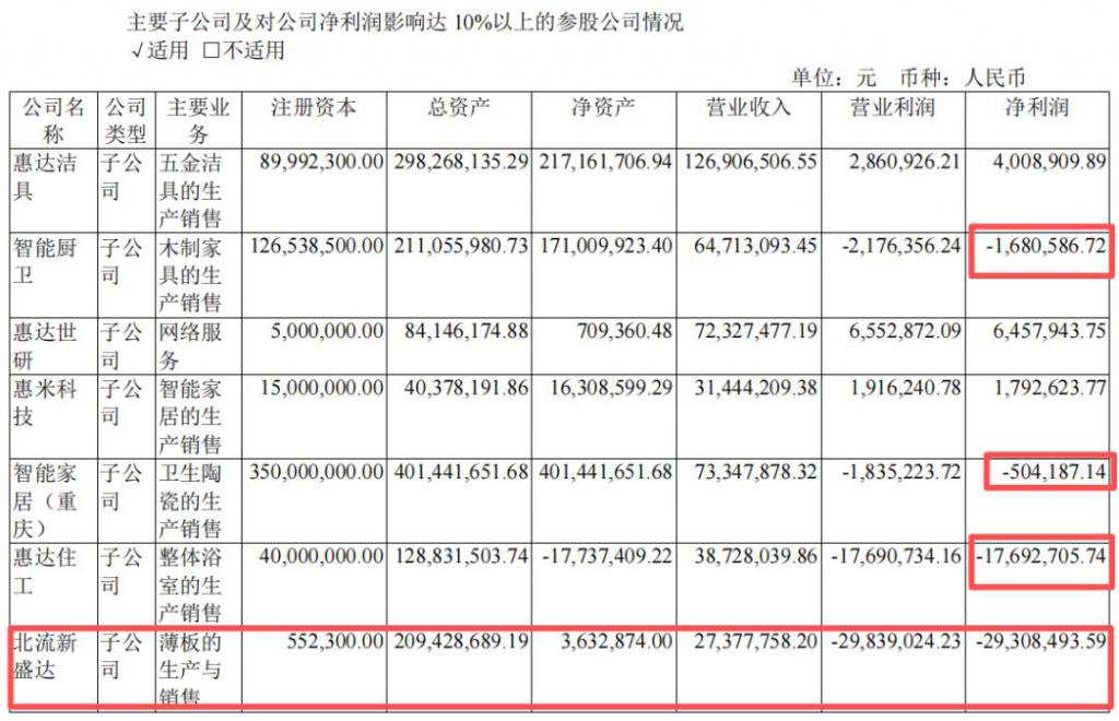 值得注意的是,在北流新胜达之外,惠达对外主要控股参股的公司出现了大面积亏损。今年上半年,智能厨卫、智能家居、惠达住工分别亏损 168 万元、50.4 万元、1769.3 万元。