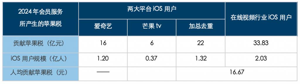 附注 2:综合财报、第三方行业研报及 QuestMobile TRUTH 中国移动互联网数据库等信息进行评估与测算。计算方法:人均贡献苹果税 = 贡献苹果税 ÷ iOS 用户规模;假定两大平台 iOS 用户消费水平可以代表在线视频行业,即二者的人均贡献苹果税等同于在线视频行业人均水平。具体计算公式如下:两大平台 iOS 用户贡献苹果税 = 爱奇艺苹果税 + 芒果 tv 苹果税;两大平台 iOS 用户规模加总去重 = 爱奇艺 iOS 用户规模 + 芒果 tv iOS 用户规模 - 爱奇艺 & 芒果 tv 重合的 iOS 用户规模;各平台 iOS 用户规模来自于 QuestMobile TRUTH 中国移动互联网数据库中 2024 年月均活跃 iOS 用户数;在线视频行业 iOS 用户规模 = 在线视频行业用户规模 × iOS 用户渗透率,该渗透率取自 QuestMobile TRUTH 中国移动互联网数据库中,爱奇艺与芒果 tv iOS 设备渗透率的平均值 26%。