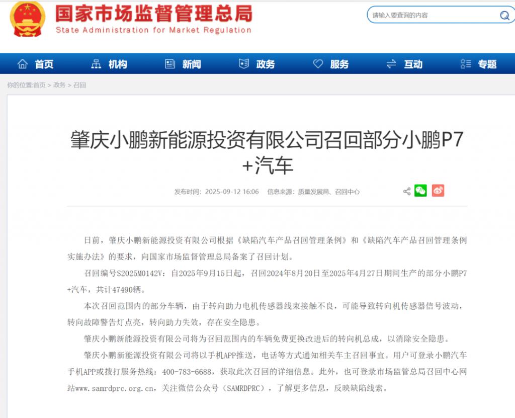 召回编号 S2025M0142V:自 2025 年 9 月 15 日起,召回 2024 年 8 月 20 日至 2025 年 4 月 27 日期间生产的部分小鹏 P7+ 汽车,共计 47490 辆。