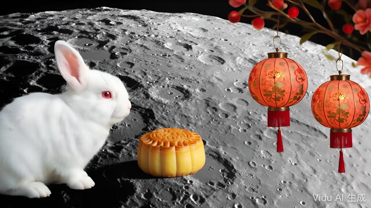 在 Vidu 里,只要上传单一产品,再加上几个关键词,就能生成颇具创意的海报。比如上传一张月饼照片,再输入 " 兔子、花灯、月球 "。生成结果不仅画面完整,还细致到阴影逻辑:月饼下方有光影,兔子脚下的灯笼也能投射出柔和的影子。