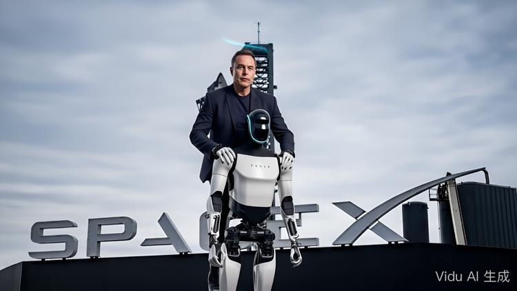 进一步尝试跨类型组合。比如上传马斯克头像、机器人参考素材。Vidu 能较好地保持马斯克的神态,还能让人物和机器人摆放到提示要求的位置。虽然最终画面略显僵硬,但逻辑是成立的。