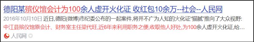 四川德阳一名殡仪馆的会计为 100 人虚开火化证,收红包 10 多万。