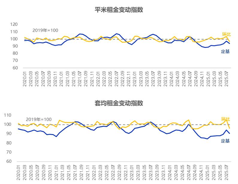 据我爱我家监测统计,2025 年 8 月,我爱我家北京住房租赁市场整租交易中,每平米平均租金与每套平均租金环比均有所下跌,环比跌幅略见明显;租金同比持续下跌。