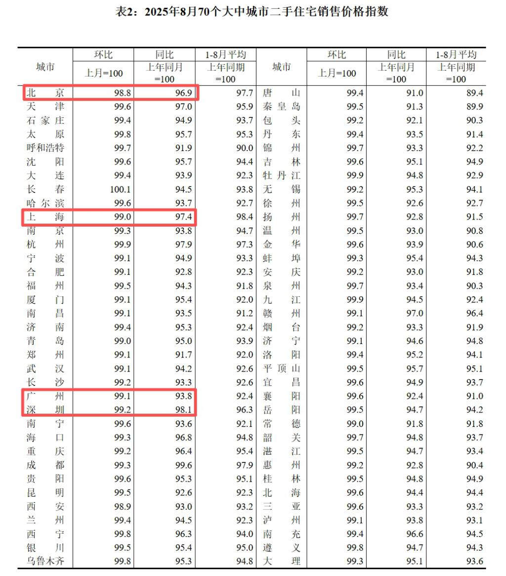 根据国家统计局公布的数据,今年 8 月份,一线城市新房、二手住宅销售价格继续齐齐下降。其中,新房销售价格环比下降 0.1%,二手住宅销售价格环比下降 1.0%。