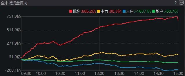 Wind 数据显示,10:30 后,各路资金的流出势头都有不同程度减弱,尤其机构资金,大幅流入了数百亿元。
