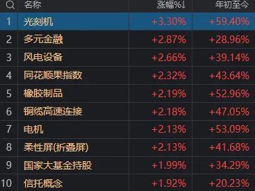 板块方面,光刻机、风电、机器人等板块涨幅居前,贵金属、旅游、猪肉等板块跌幅居前。