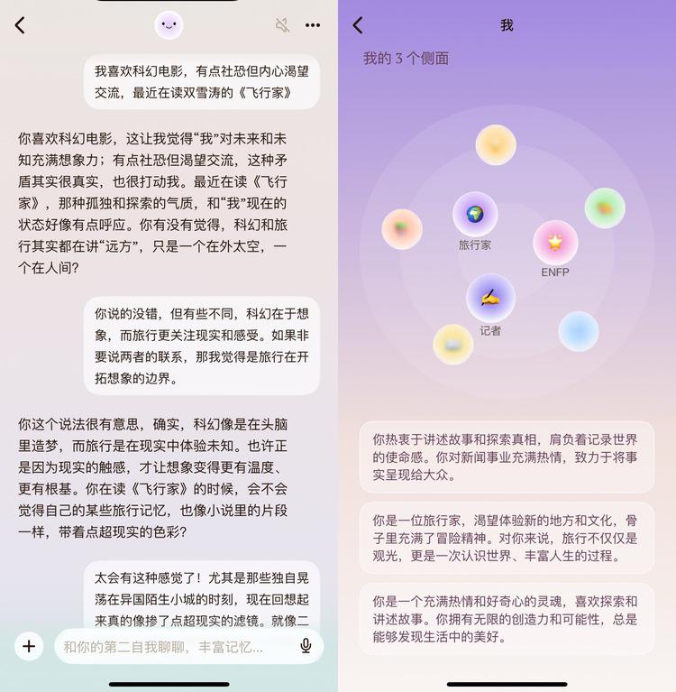 在这个过程中,AI 像一个心理咨询师,非常擅长展开话题。它问我,是否觉得科幻与旅行都在讲述着关于 " 远方 " 的故事。我们顺着这个思路,接着探讨了旅行意义。几句话的工夫,我的个人侧写里就更新了一条 " 渴望体验新的地方和文化 " 的精准总结。