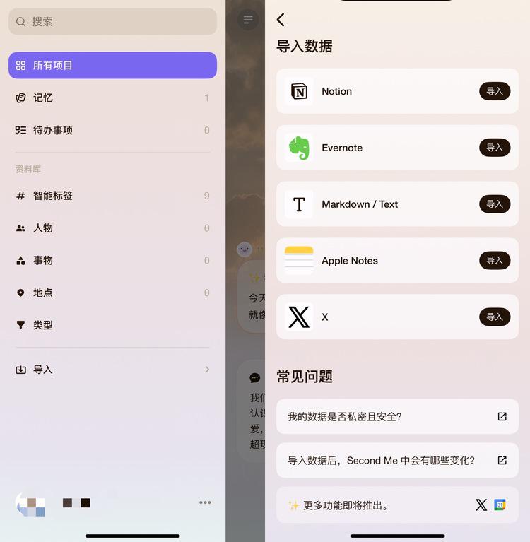 除了对话,我还可以选择直接导入自己过往的思考,比如笔记、文章、甚至社交媒体的帖子,通过更高密度的数据来理解我,让 Second Me 获取更多干货记忆。