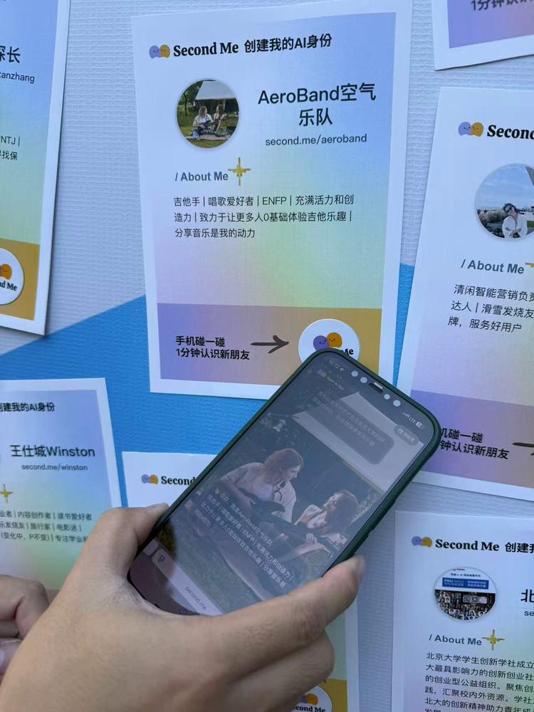 真正体现其网络效应的,是大会现场那公共墙。上面遍布着来自各个参会人的 Second Me 卡片。我可以把我的 AI 卡片也 " 贴 " 到墙上,等待有缘人来 " 碰 ",也可以主动去 " 碰 " 那些我感兴趣的卡片,让 AI 先行社交。